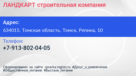ЛАНДКАРТ, строительная компания по адресу 634015, Томская область, Томск, Репина, 10 в дальнейшем Организация, размещена в следующих категориях: