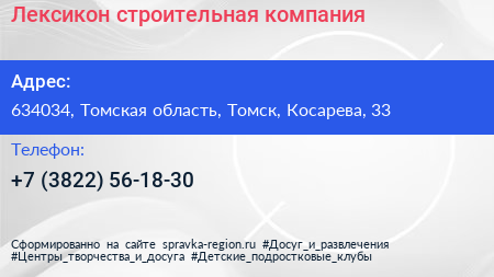 Лексикон, строительная компания по адресу 634034, Томская область, Томск, Косарева, 33 в дальнейшем Организация, размещена в следующих категориях: