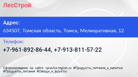 ЛесСтрой по адресу 634507, Томская область, Томск, Мелиоративная, 12 в дальнейшем Организация, размещена в следующих категориях: