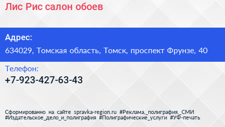 Лис Рис, салон обоев по адресу 634029, Томская область, Томск, проспект Фрунзе, 40 в дальнейшем Организация, размещена в следующих категориях: