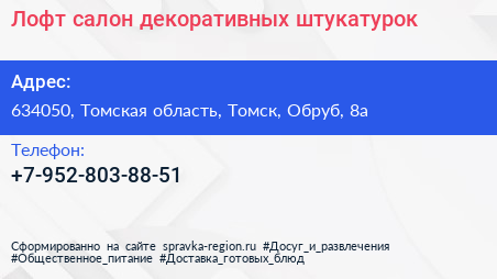 Лофт, салон декоративных штукатурок по адресу 634050, Томская область, Томск, Обруб, 8а в дальнейшем Организация, размещена в следующих категориях: