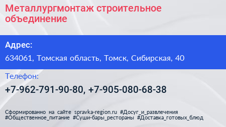 Металлургмонтаж, строительное объединение по адресу 634061, Томская область, Томск, Сибирская, 40 в дальнейшем Организация, размещена в следующих категориях: