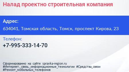 Налад, проектно-строительная компания по адресу 634041, Томская область, Томск, проспект Кирова, 23 в дальнейшем Организация, размещена в следующих категориях:
