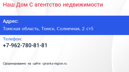 Наш Дом-С, агентство недвижимости по адресу Томская область, Томск, Солнечная, 2 ст5 в дальнейшем Организация, размещена в следующих категориях: