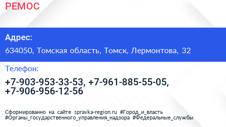 РЕМОС по адресу 634050, Томская область, Томск, Лермонтова, 32 в дальнейшем Организация, размещена в следующих категориях: