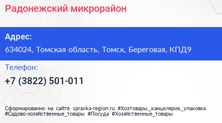 Радонежский, микрорайон по адресу 634024, Томская область, Томск, Береговая, КПД9 в дальнейшем Организация, размещена в следующих категориях: