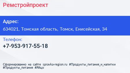 Ремстройпроект по адресу 634021, Томская область, Томск, Енисейская, 34 в дальнейшем Организация, размещена в следующих категориях: