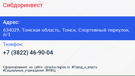 Сибдоринвест по адресу 634029, Томская область, Томск, Спортивный переулок, 6/1 в дальнейшем Организация, размещена в следующих категориях: