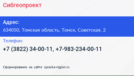 Сибгеопроект по адресу 634050, Томская область, Томск, Советская, 2 в дальнейшем Организация, размещена в следующих категориях: