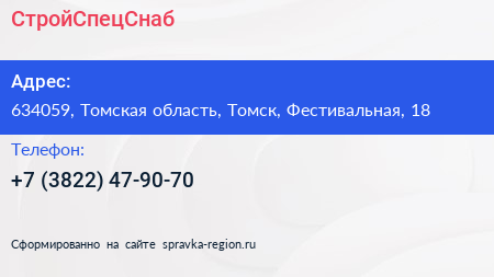 СтройСпецСнаб по адресу 634059, Томская область, Томск, Фестивальная, 18 в дальнейшем Организация, размещена в следующих категориях: