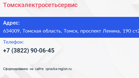 Томскэлектросетьсервис по адресу 634009, Томская область, Томск, проспект Ленина, 190 ст2 в дальнейшем Организация, размещена в следующих категориях: