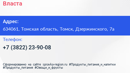 Власта по адресу 634061, Томская область, Томск, Дзержинского, 7а в дальнейшем Организация, размещена в следующих категориях: