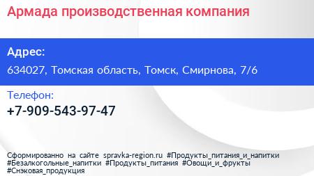Армада, производственная компания по адресу 634027, Томская область, Томск, Смирнова, 7/6 в дальнейшем Организация, размещена в следующих категориях: