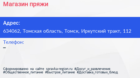 Магазин пряжи по адресу 634062, Томская область, Томск, Иркутский тракт, 112 в дальнейшем Организация, размещена в следующих категориях: