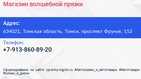 Магазин волшебной пряжи по адресу 634021, Томская область, Томск, проспект Фрунзе, 152 в дальнейшем Организация, размещена в следующих категориях: