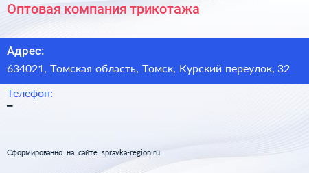 Оптовая компания трикотажа по адресу 634021, Томская область, Томск, Курский переулок, 32 в дальнейшем Организация, размещена в следующих категориях: