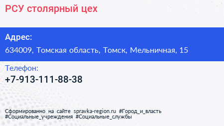 РСУ, столярный цех по адресу 634009, Томская область, Томск, Мельничная, 15 в дальнейшем Организация, размещена в следующих категориях: