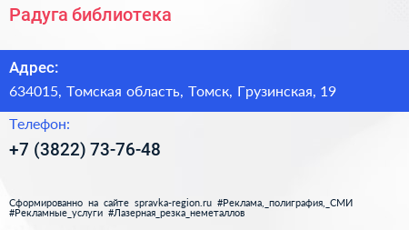 Радуга, библиотека по адресу 634015, Томская область, Томск, Грузинская, 19 в дальнейшем Организация, размещена в следующих категориях:
