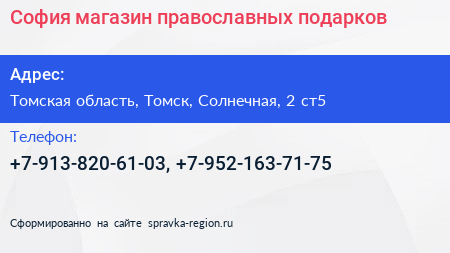 София, магазин православных подарков по адресу Томская область, Томск, Солнечная, 2 ст5 в дальнейшем Организация, размещена в следующих категориях: