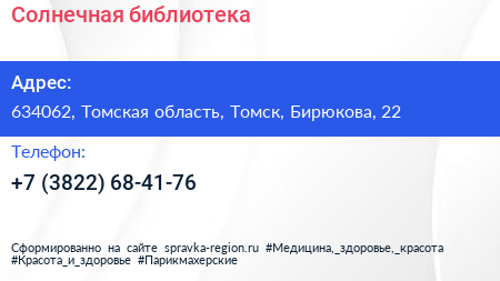 Солнечная, библиотека по адресу 634062, Томская область, Томск, Бирюкова, 22 в дальнейшем Организация, размещена в следующих категориях: