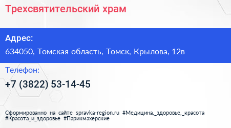 Трехсвятительский храм по адресу 634050, Томская область, Томск, Крылова, 12в в дальнейшем Организация, размещена в следующих категориях: