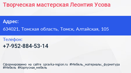 Творческая мастерская Леонтия Усова по адресу 634021, Томская область, Томск, Алтайская, 105 в дальнейшем Организация, размещена в следующих категориях: