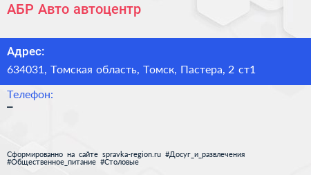 АБР-Авто, автоцентр по адресу 634031, Томская область, Томск, Пастера, 2 ст1 в дальнейшем Организация, размещена в следующих категориях: