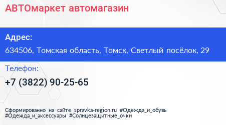 АВТОмаркет, автомагазин по адресу 634506, Томская область, Томск, Светлый посёлок, 29 в дальнейшем Организация, размещена в следующих категориях: