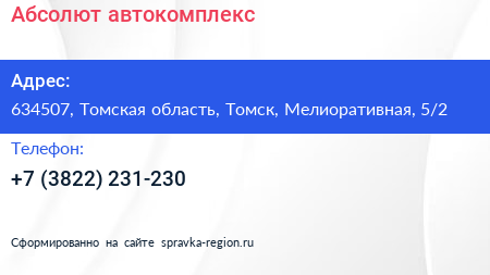 Абсолют, автокомплекс по адресу 634507, Томская область, Томск, Мелиоративная, 5/2 в дальнейшем Организация, размещена в следующих категориях: