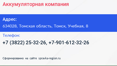 Аккумуляторная компания по адресу 634028, Томская область, Томск, Учебная, 8 в дальнейшем Организация, размещена в следующих категориях: