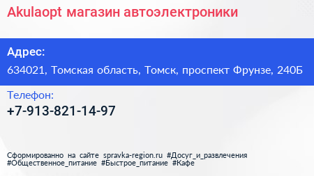Akulaopt, магазин автоэлектроники по адресу 634021, Томская область, Томск, проспект Фрунзе, 240Б в дальнейшем Организация, размещена в следующих категориях: