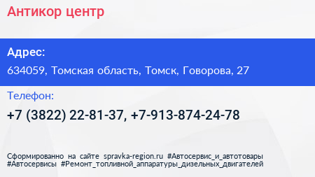 Антикор центр по адресу 634059, Томская область, Томск, Говорова, 27 в дальнейшем Организация, размещена в следующих категориях:
