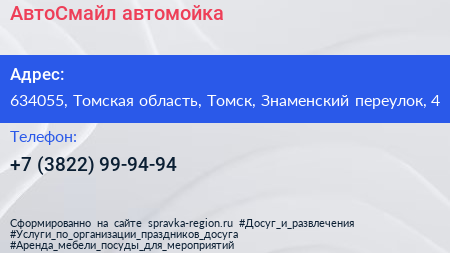 АвтоCмайл, автомойка по адресу 634055, Томская область, Томск, Знаменский переулок, 4 в дальнейшем Организация, размещена в следующих категориях: