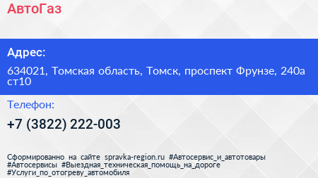 АвтоГаз по адресу 634021, Томская область, Томск, проспект Фрунзе, 240а ст10 в дальнейшем Организация, размещена в следующих категориях: