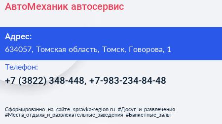 АвтоMеханик, автосервис по адресу 634057, Томская область, Томск, Говорова, 1 в дальнейшем Организация, размещена в следующих категориях:
