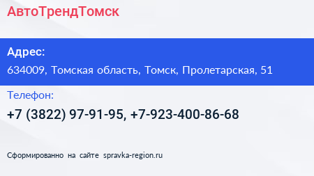 АвтоТрендТомск по адресу 634009, Томская область, Томск, Пролетарская, 51 в дальнейшем Организация, размещена в следующих категориях: