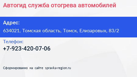 Автогид, служба отогрева автомобилей по адресу 634021, Томская область, Томск, Елизаровых, 83/2 в дальнейшем Организация, размещена в следующих категориях: