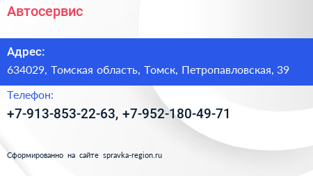 Автосервис по адресу 634029, Томская область, Томск, Петропавловская, 39 в дальнейшем Организация, размещена в следующих категориях: