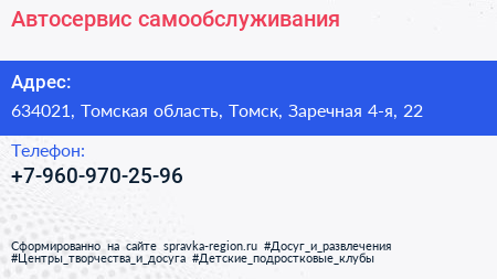 Автосервис самообслуживания по адресу 634021, Томская область, Томск, Заречная 4-я, 22 в дальнейшем Организация, размещена в следующих категориях: