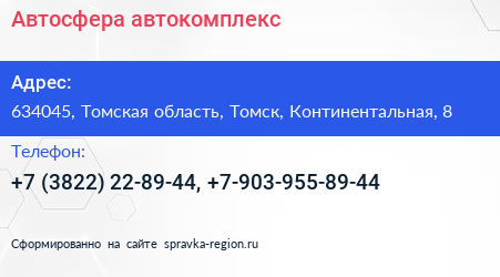 Автосфера, автокомплекс по адресу 634045, Томская область, Томск, Континентальная, 8 в дальнейшем Организация, размещена в следующих категориях: