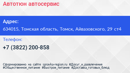 Автотюн, автосервис по адресу 634015, Томская область, Томск, Айвазовского, 29 ст4 в дальнейшем Организация, размещена в следующих категориях: