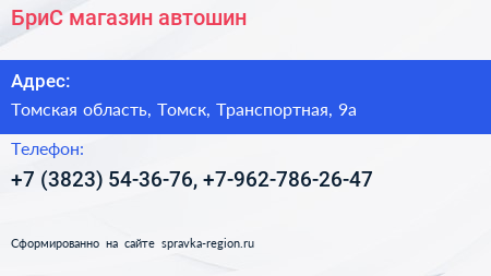 БриС, магазин автошин по адресу Томская область, Томск, Транспортная, 9а в дальнейшем Организация, размещена в следующих категориях: