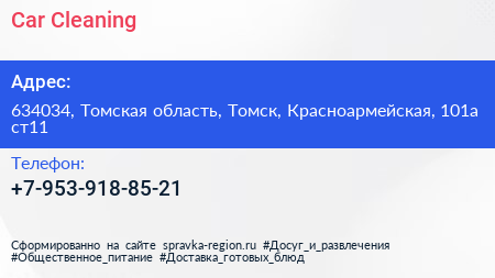 Car Cleaning по адресу 634034, Томская область, Томск, Красноармейская, 101а ст11 в дальнейшем Организация, размещена в следующих категориях: