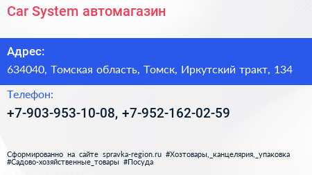 Car System, автомагазин по адресу 634040, Томская область, Томск, Иркутский тракт, 134 в дальнейшем Организация, размещена в следующих категориях: