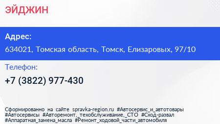 ЭЙДЖИН по адресу 634021, Томская область, Томск, Елизаровых, 97/10 в дальнейшем Организация, размещена в следующих категориях: