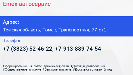 Emex, автосервис по адресу Томская область, Томск, Транспортная, 77 ст1 в дальнейшем Организация, размещена в следующих категориях: