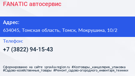FANATIC, автосервис по адресу 634045, Томская область, Томск, Мокрушина, 10/2 в дальнейшем Организация, размещена в следующих категориях: