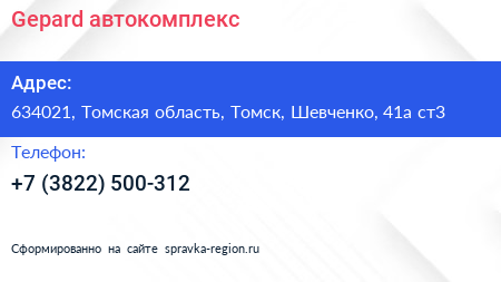 Gepard, автокомплекс по адресу 634021, Томская область, Томск, Шевченко, 41а ст3 в дальнейшем Организация, размещена в следующих категориях: