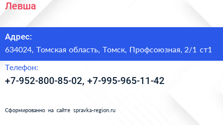 Левша по адресу 634024, Томская область, Томск, Профсоюзная, 2/1 ст1 в дальнейшем Организация, размещена в следующих категориях: