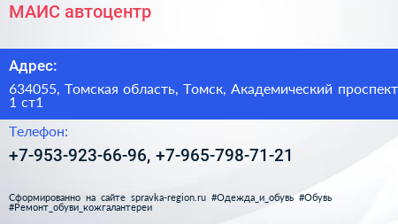 МАИС, автоцентр по адресу 634055, Томская область, Томск, Академический проспект, 1 ст1 в дальнейшем Организация, размещена в следующих категориях:
